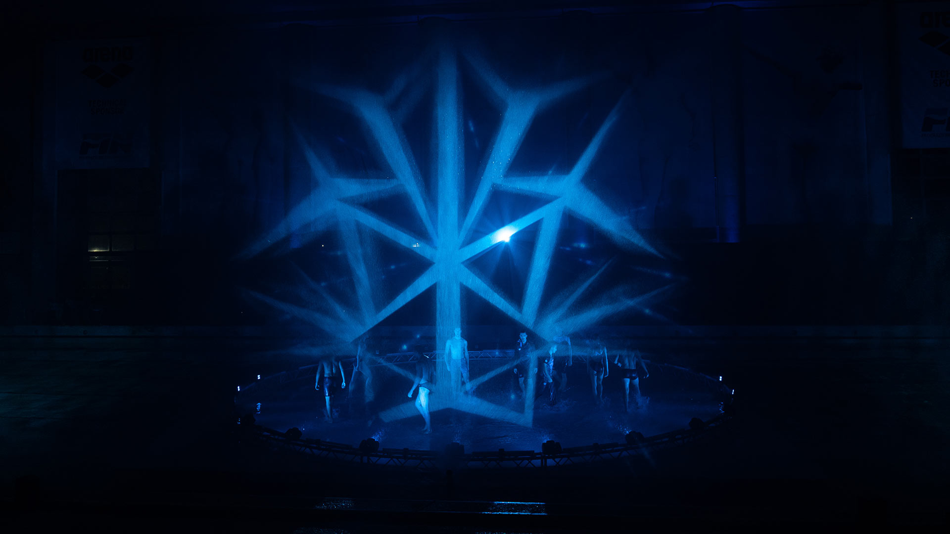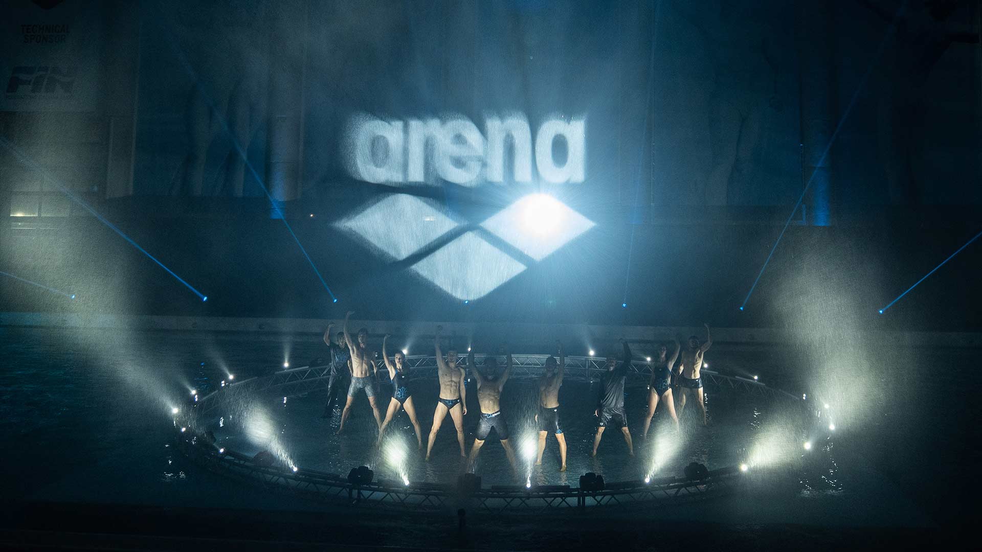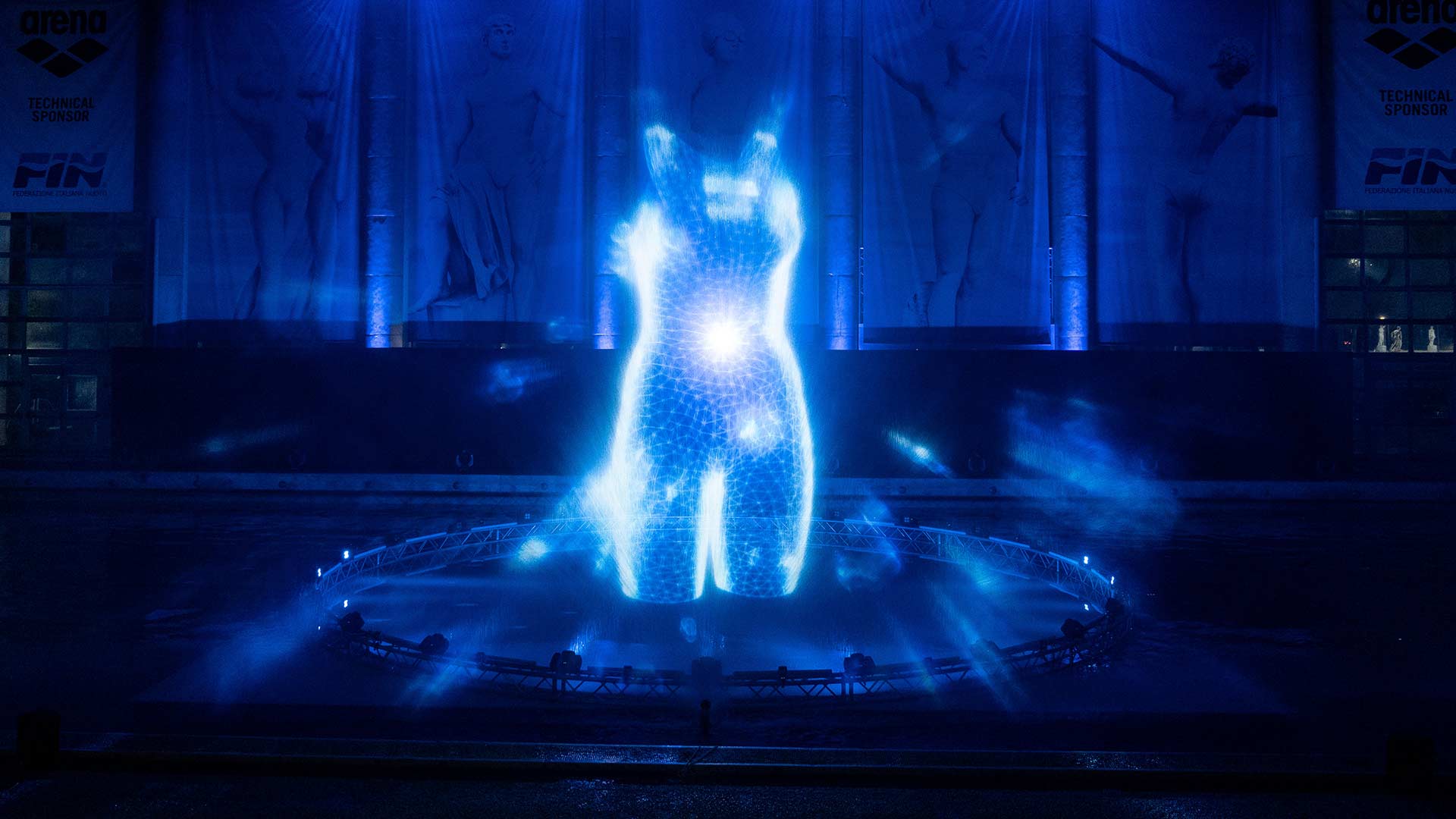 La nostra ultima tecnologia: uno schermo d’acqua che crea particolari effetti scenici con ologrammi in movimento. Su questa superficie modellabile abbiamo proiettato loghi ed effetti particellari, per concludere con la visualizzazione 3D del costume che Arena ha disegnato per gli atleti olimpici.