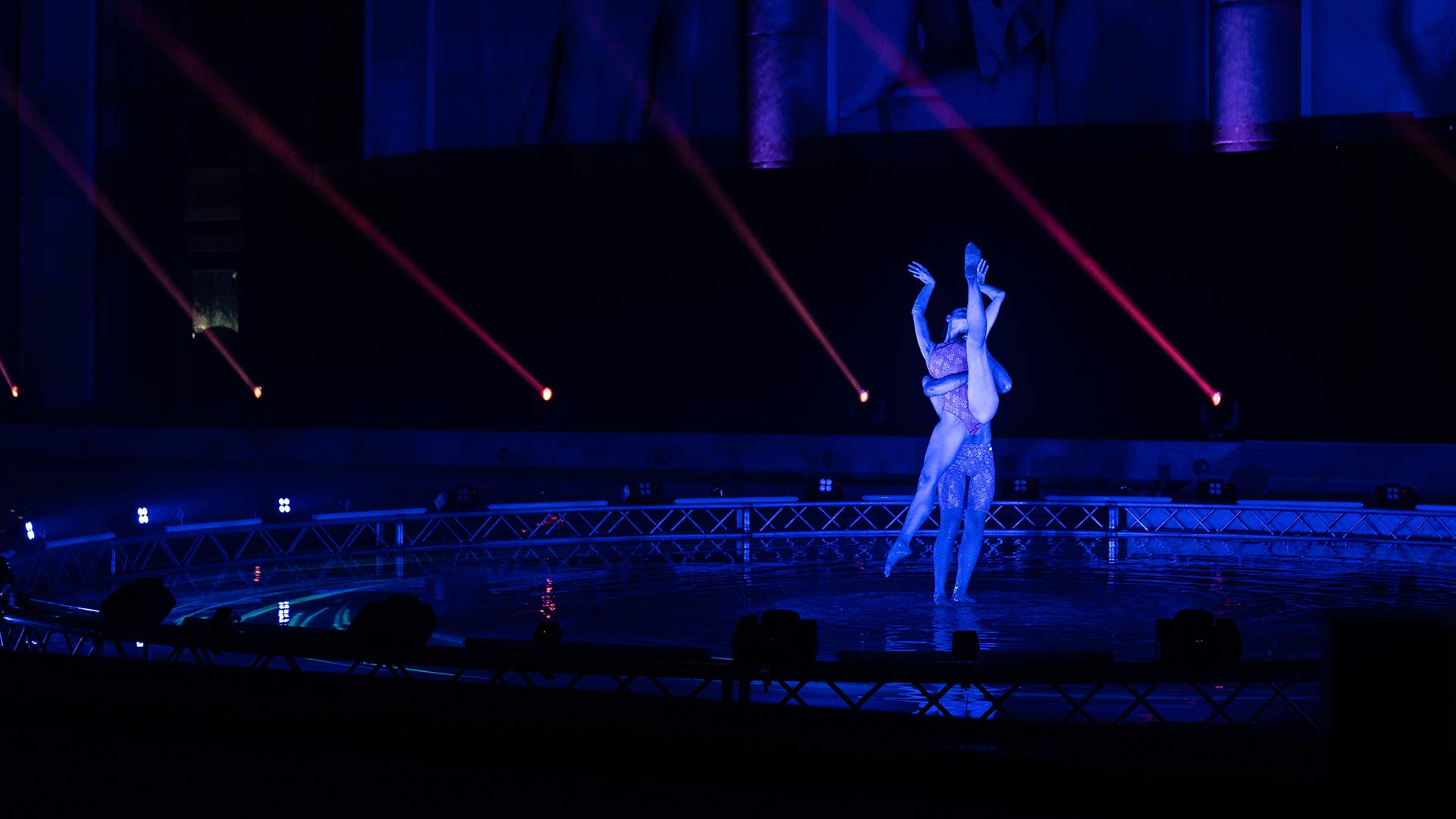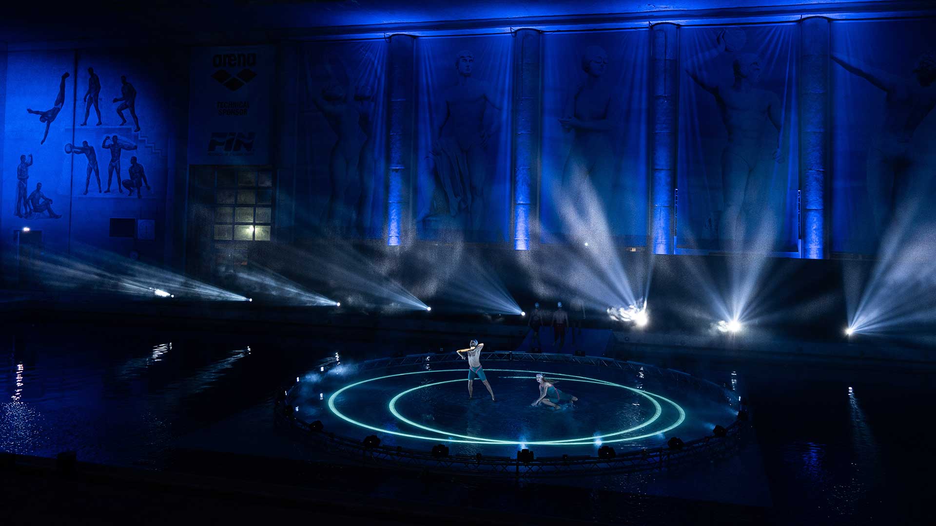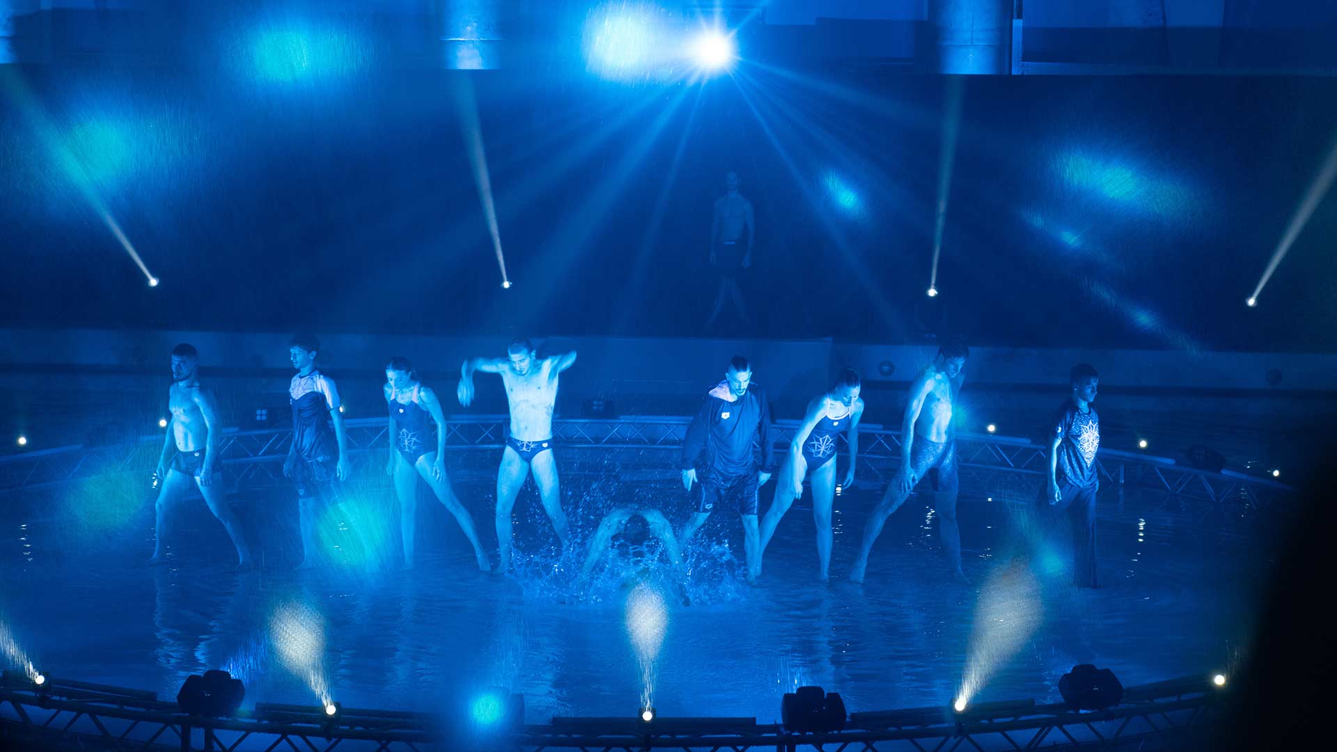 Sede del nostro show è la Piscina dei Mosaici, un’icona del nuoto italiano all’interno del Foro Italico di Roma. La sfida è stata realizzare un palco interamente in acqua per i nostri danzatori, aggiungendo interventi artistici coordinati di atleti provenienti dalla nazionale di nuoto sincronizzato e di tuffo da trampolino.