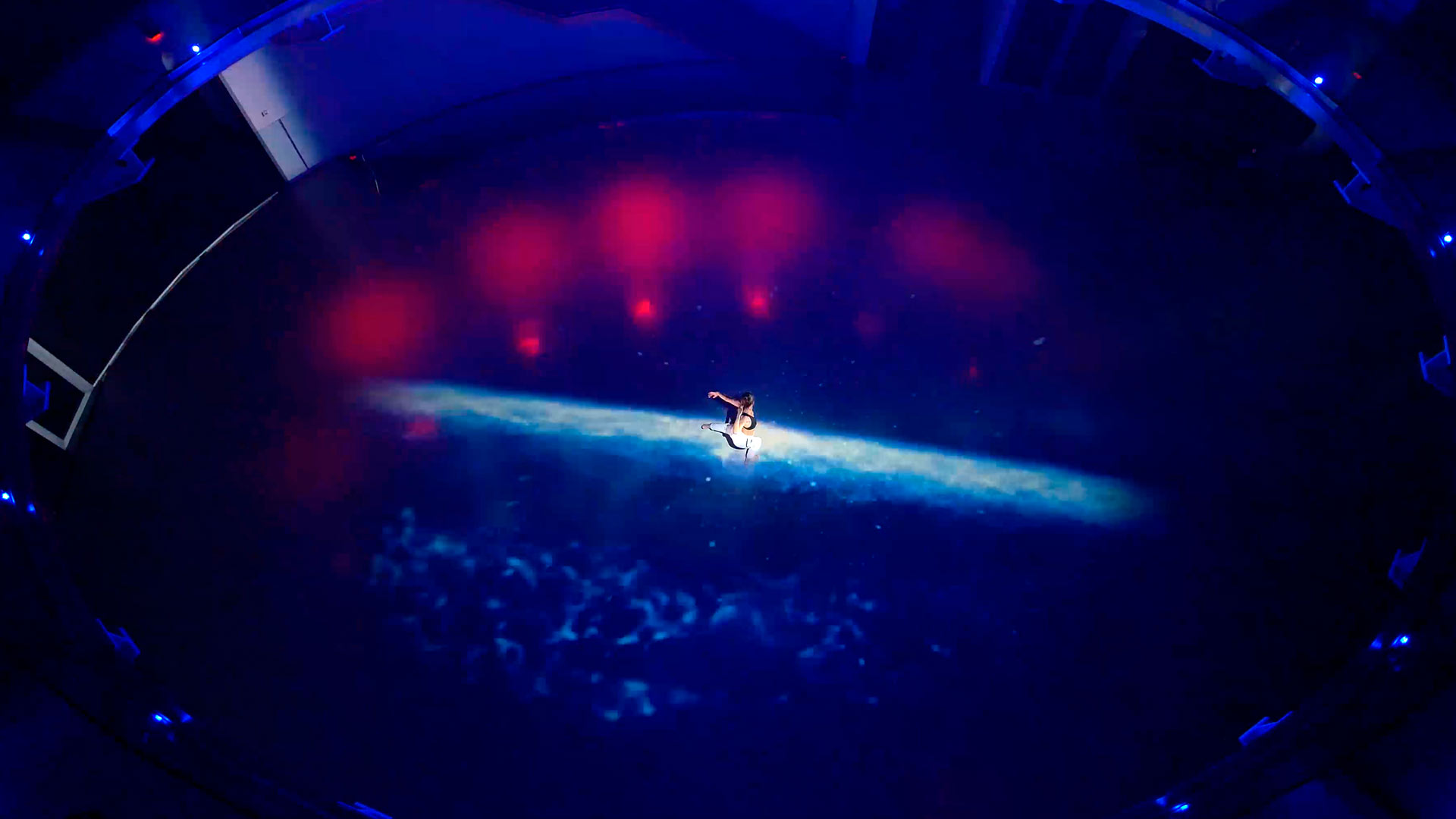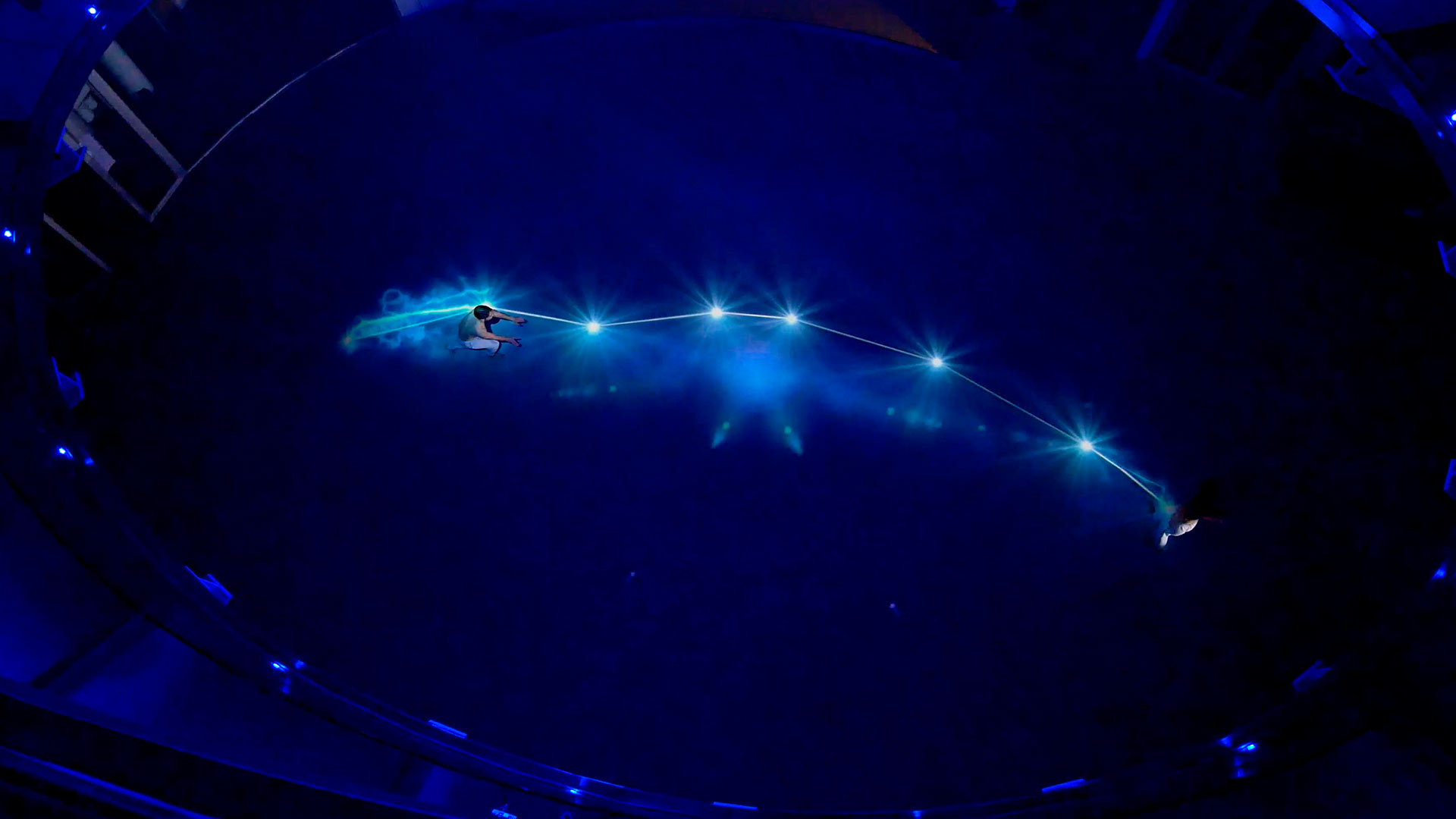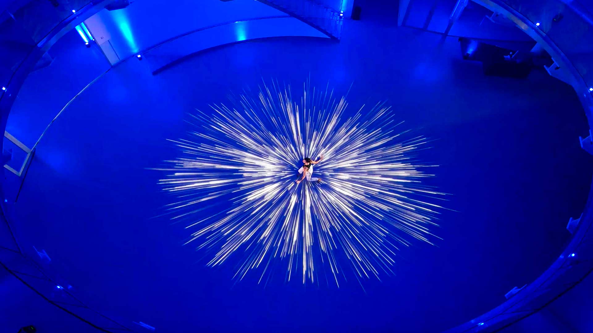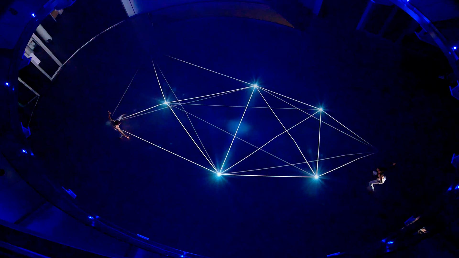 La combinazione di video mapping a pavimento e performance dal vivo viene resa completamente interattiva grazie allo speciale sensore che traccia le coordinate di posizione di corpi fisici nello spazio. Ad esso si aggiunge un nuovo software di gestione dei contenuti che ci permette di generare grafiche responsive in tempo reale attivate dallo spostamento dei performer nello spazio.
